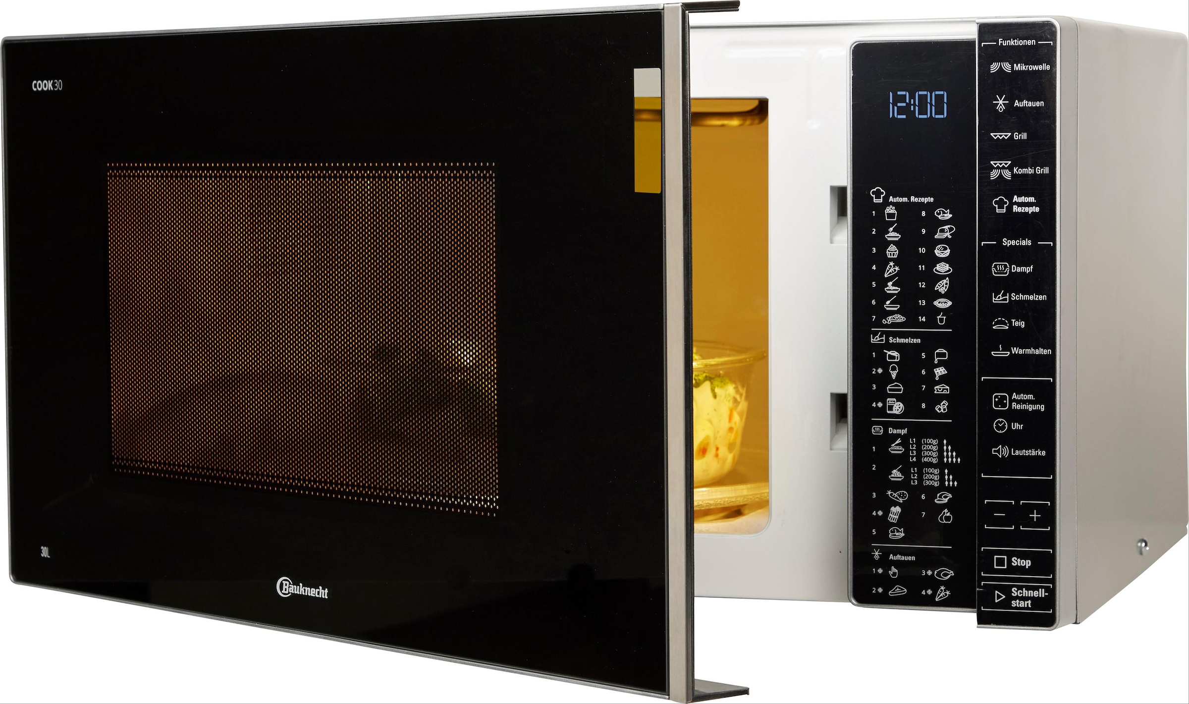 Weitere Vorteile | Ihr persönlicher Kochassistent. Die FamilyCook Mikrowelle bietet mit dem 30L Garraum Platz für sämtliche Gerichte! Warmhalte-Funktion, AutoClean & AutoCook-Funktion für den dynamischen Lifestyle. Smarte Funktionen unterstützen bei allen Zubereitungen: von Joghurt-Funktion, Dampfgarfunktion und Teig bis Schokoladen- & Käse Fondue!;Dank der Dampfgarfunktion und dem beiliegenden Dampfgarer wird gesunde Ernährung kinderleicht - Nährstoffe und Vitamine bleiben beim Garen optimal erhalten, was ideal für Gemüse, Fisch, Reis oder Pasta ist. Gesunde Gaumenfreude par excellence;Teig-Funktion - für leckeres hausgemachtes Brot oder Kuchen. Die beständige Temperatur von 38° sorgt für perfektes Aufgehen des Teiges;Schmelz-Funktion - überraschen Sie Ihre Gäste mit einem leckeren Käse- oder Schokoladenfondue. Perfekt geeignet zum Schmelzen oder Auftauen von Butter, Eis, Schokolade und vielem mehr;Warmhalten - servieren Sie Ihre Speisen immer bei perfekter Temperatur! Mit dieser Funktion halten Sie Ihr |
