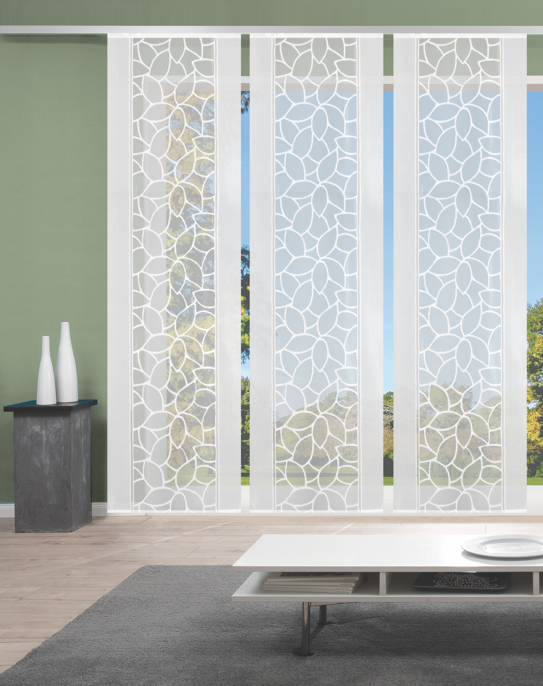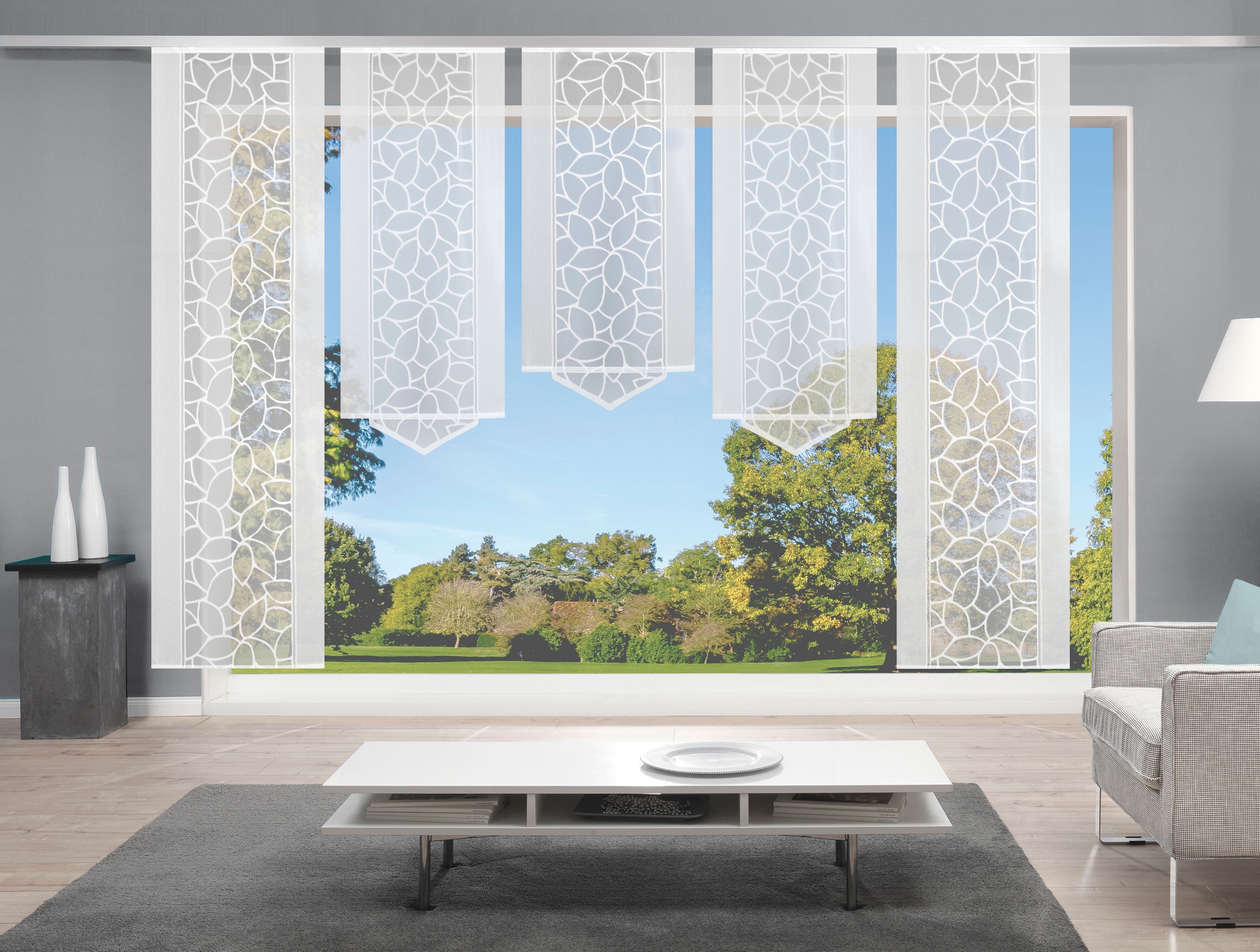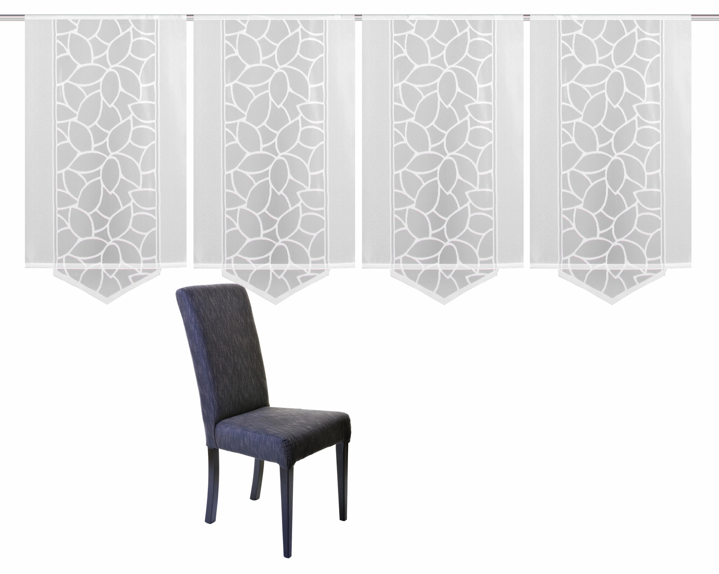 Das zarte Blätterdesign auf dem transparenten Jacquardgrund fügt sich optisch ausgezeichnet in verschiedene Wohnstile ein. Das Set besteht aus 2x Schiebevorhängen mit geradem Abschluss (Höhe 225cm bzw. 245cm) und 4x Schiebevorhängen mit Dreiecksabschluss (2x Höhe 160cm und 2x Höhe 145cm). Aufhängung erfolgt mittels Flauschband und Klettschiene an Ihrer Gardinenschiene. »JENNA« lässt sich dank des mitgelieferten Zubehörs spielend einfach an gängigen Gardinenschienen anbringen, so zaubern Sie mühelos eine behagliche Wohlfühlatmosphäre in Ihren vier Wänden. Zur Beschwerung und Stabilisierung dient die beiliegende Beschwerungsstange.