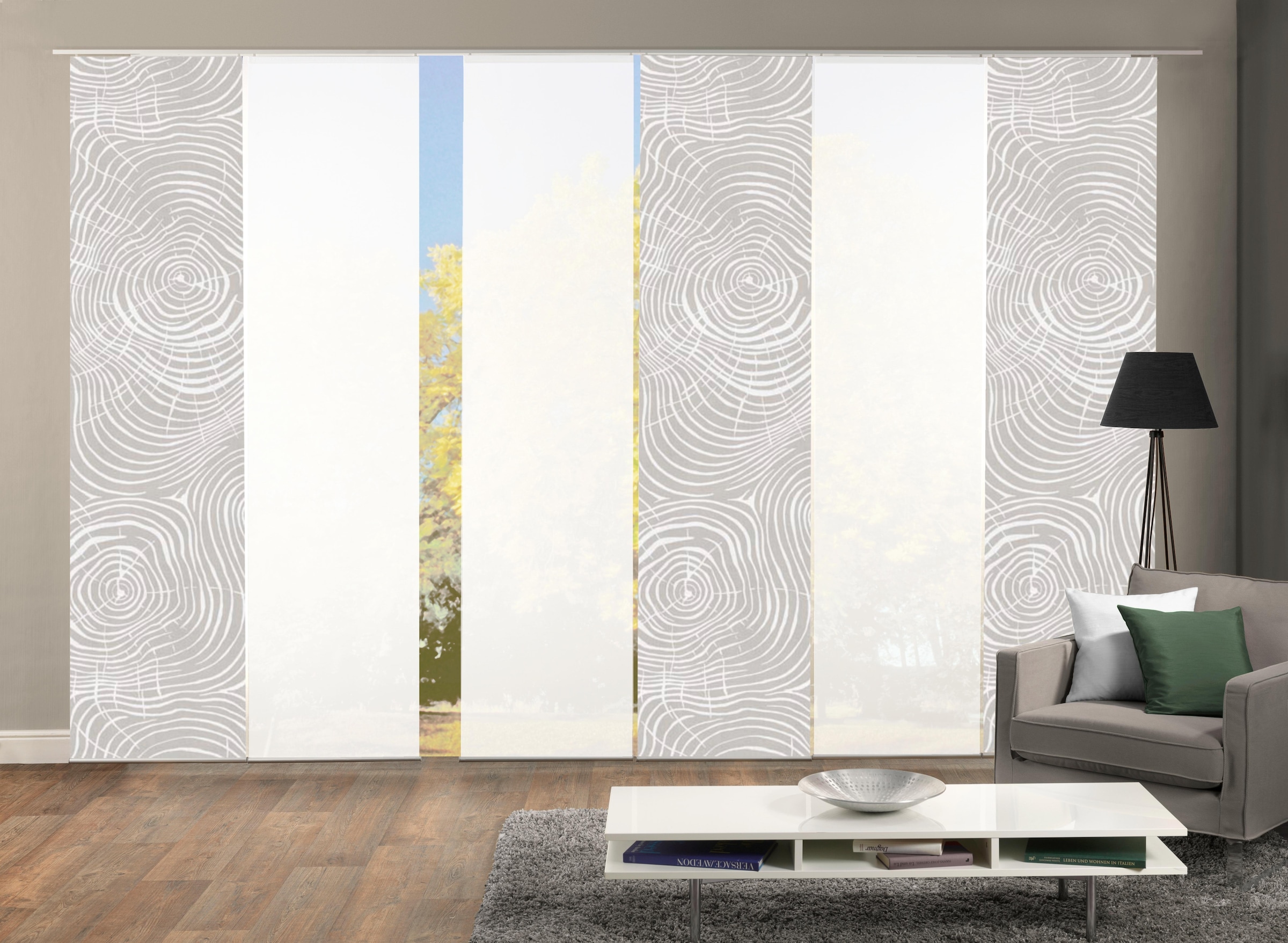 Schöne moderne SchiebevorhangSets der Marke HOME WOHNIDEEN. Die Schiebevorhänge bestehen aus 100% Polyester. Sie werden inkl. Paneelwagen und Klemmleiste geliefert. Sets können bestehen aus 3, 4, 5 oder 6 Schiebevorhängen, digitalbedruckte aber auch Unifarbene, blickdicht wie auch halbtransparent.