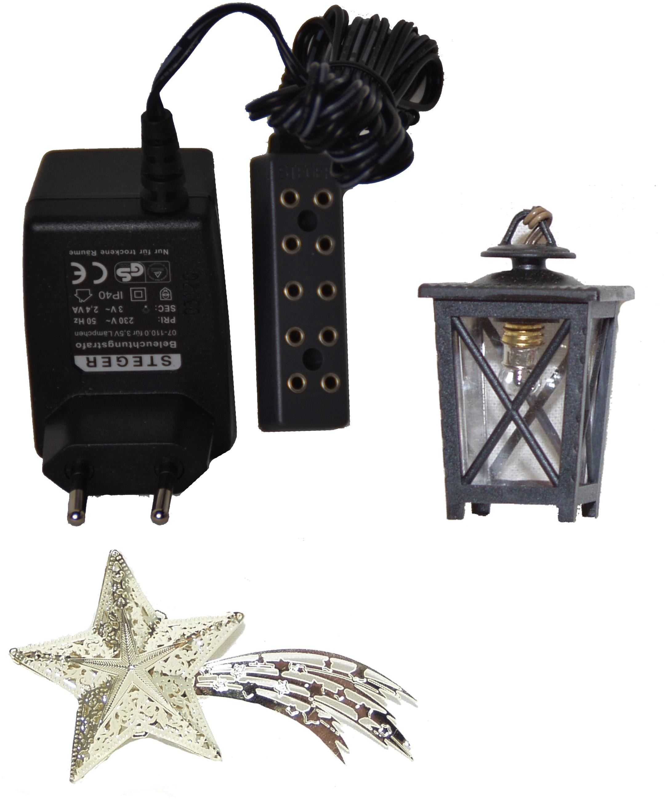 Weihnachtskrippen-Zubehör-Set, 3-teilig. Filigraner Komet aus Metall, goldfarben, komplett mit Beleuchtung 4,5V und ca. 50 cm Kabel mit Stecker. Länge ca. 9 cm. Laterne aus Kunstoff mit Beleuchtung. Maße ca. (H/B/T): 7/4/4 cm. Beleuchtungstrafo mit 5 Anschlüssen für die Krippenbeleuchtung.