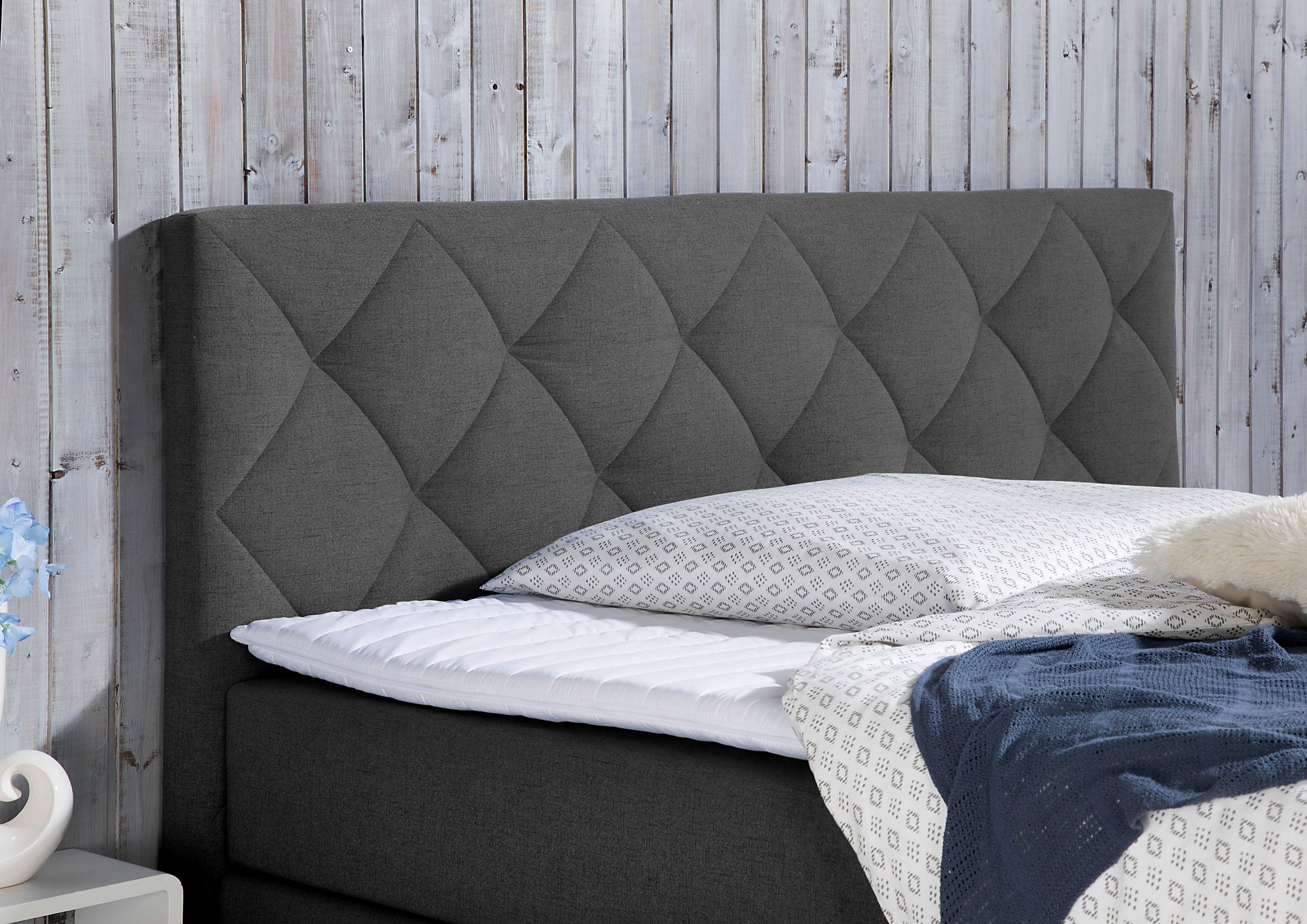 Wissenswertes | Boxspringbett mit ca. 9 cm starken, softig gepolsterten Kopfteil mit dekorativer Rautensteppung und Einzügen. In drei Farben, vier Größen und zwei Ausführungen. Bezug Strukturstoff (100% PES). Vier schräge, schwarze Holzfüße, ca. 15 cm hoch. Stabiles Holzgrundgestell mit Querholmen und Hartfaserplatte mit 10 cm dicken Bonellfederkern, der mittig mit Matratzenspiegel (Doppeltuch) versehen ist. Gesamthöhe ca. 14 cm. 176 Federn bei Größe 100/200 cm, je 110 Federn Federn pro Unterbox bei Größe 140/200 cm, je 110 Federn pro Unterbox bei Größe 160/200 cm und je 132 Federn pro Unterbox bei Größe 180/200 cm. Obermatratze: Bonell- oder 7-Zonen Tonnentaschenfederkern, in Härtegrad 2, 3 oder 4. Die Matratze ist beidseitig mit Schaumpolster umhüllt, oben und unten mittig mit Matratzenspiegel (Doppeltuch) versehen und seitlich glatt mit Strukturstoff bezogen. Inkl. Komfortschaum-Topper, ca. 4 cm. Details: