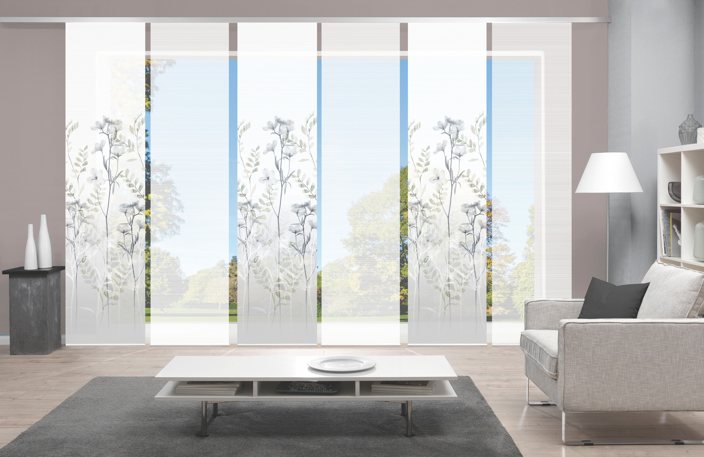 Hinweis Dekoration | Die angegebenen Maße sind die fertig dekorierten Maße.;Eine Schiebegardine ist eine schmale, glatt hängende Stoffbahn, die sich sowohl als Sichtschutz als auch zur Raumteilung eignet. Durch die Schiebetechnik sind Schiebegardinen sehr flexibel einsetzbar. |