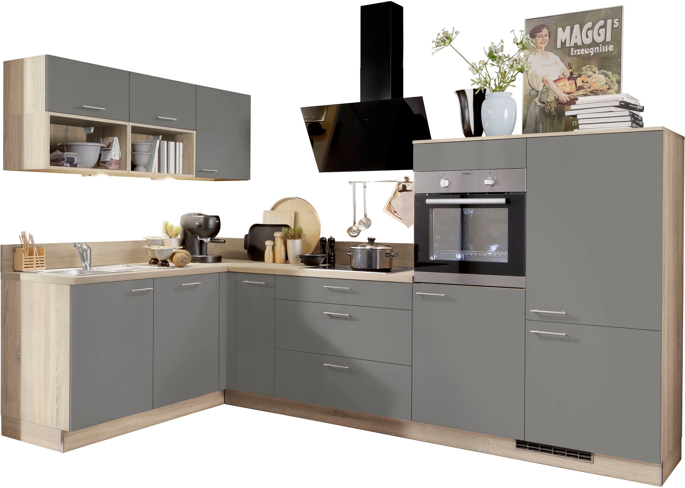 KOCHSTATION Küchenzeile »KS-Scafa, vormontiert, mit höhenverstellbaren Füßen« vormontiert, wahlweise mit E-Geräten, Stellbreite 305 x 185 cm