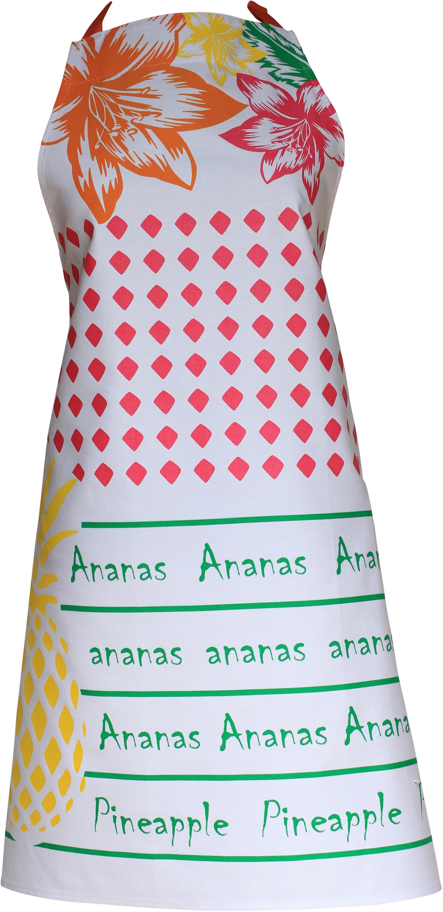 Die moderne Schürze „Tropic Fruits“ von Stuco mit Blüten- und Ananasmotiv ist erstklassig verarbeitet. Sie wurde mit viel Liebe zum Detail designt und schafft mit ihrem sommerlichen Motiv eine schöne Atmosphäre. Beim Kochen und Backen macht sie eine gute Figur und schützt empfindliche Kleidung vor Flecken. Die Schürze ist mit einer praktischen Innentasche und am Nackenband mit einer verstellbaren Metallöse ausgestattet. Waschbar bei 40°C, Maschinenwäsche. Material: 100% Baumwolle. Maße ca. 80x85 cm.