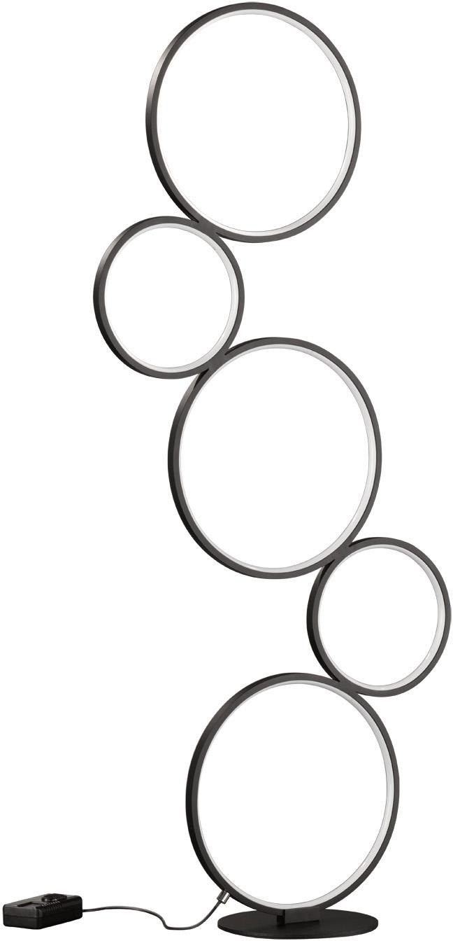 Mit ihren fünf aufeinander gestellten Ringen unterschiedlichen Durchmessers, ist die Stehleuchte RONDO ein echter Eyecatcher. Die Stehleuchte verfügt über einen integrierten Dimmer, der über den Schnurschalter gesteuert wird. Damit lässt sich die Helligkeit der in den jeweiligen Kreis-Innenseiten verbauten LEDs flexibel steuern. Die 115 cm hohe Stehleuchte ist ein wahres Deko-Element und wertet jeden Wohnraum stilvoll auf. Dank der Farbgestaltung in Weiß und in Schwarz matt, kann die Leuchte mit vielen Einrichtungsstilen kombiniert werden. Darüber hinaus verfügt die Leuchte über eine moderne LED Technologie, die sich durch eine hohe Lichtqualität und Energieeffizienz auszeichnet. Im Vergleich zu herkömmlichen Halogen Leuchtmitteln lassen sich bis zu 80% der Energiekosten sparen. Zusätzlich haben LED Lichtquellen eine lange Lebensdauer, produzieren weniger Wärme und schonen die Umwelt.