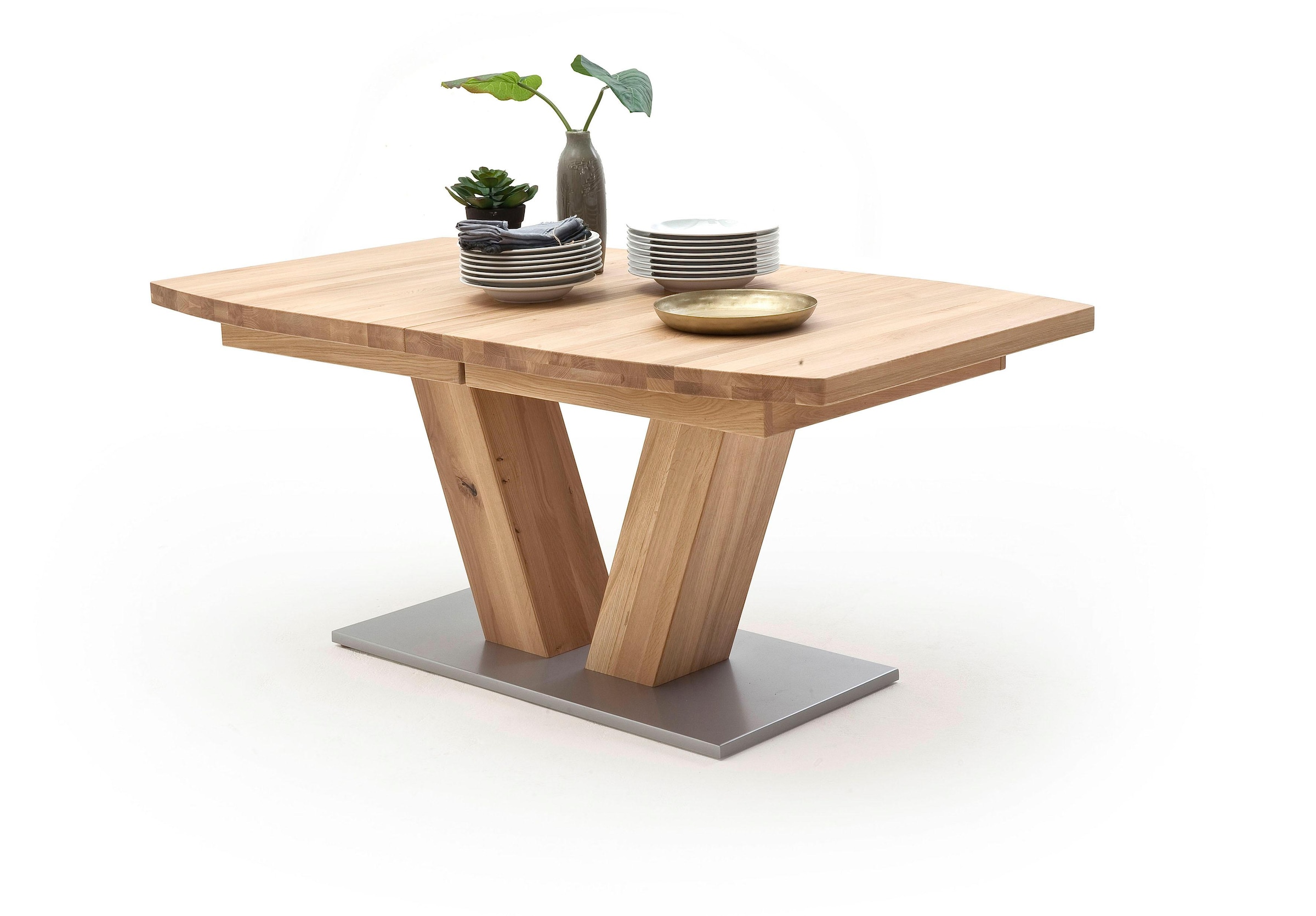 Wissenswertes | Ausziehbarer Tisch mit Synchronauszug;Tischplatte aufgedoppelt 50 mm;Tisch belastbar bis 90 Kg;Massiv durchgehende Lamelle geölt, Bodenplatte in MDF silberfarbig lackiert;2 Innenliegende Einlegeplatten |