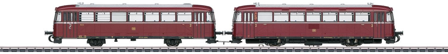 Schienenbus-Motorwagen Baureihe VT 98.9 und Schienenbus-Steuerwagen Baureihe VS 98 der Deutschen Bundesbahn (DB). In purpurroter Ursprungsfarbgebung. Motorwagen-Betriebsnummer VT 98 9705, Steuerwagen-Betriebsnummer VS 98 306. Betriebszustand Anfang der 1960er-Jahre. Motorwagen mit Digital-Decoder mfx+ und umfangreichen Geräusch- und Lichtfunktionen. Geregelter Hochleistungsantrieb. 2 Achsen angetrieben. Haftreifen. Serienmäßig eingebaute Innenbeleuchtung. Fahrtrichtungsabhängig wechselndes Dreilicht-Spitzensignal und 2 rote Schlusslichter, zusammen mit der Innenbeleuchtung konventionell in Betrieb, digital schaltbar. Spitzenlicht am Motorwagen je Seite jeweils separat digital abschaltbar. Steuerwagen mit serienmäßig eingebauter Innenbeleuchtung. Auf der Steuerseite fahrtrichtungsabhängig wechselndes Dreilicht-Spitzensignal mit 2 roten Schlusslichtern. Zwischen den Fahrzeug-Einheiten stromführende Kupplungsdeichsel-Verbindung mit Kulissenführung. Stromführende Kupplungsdeichsel und Bremsschläuche liegen bei. Beleuchtung mit wartungsfreien warmweißen und roten Leuchtdioden (LED). Beide Fahrzeug-Einheiten sowie der optional erhältliche Beiwagen mit freiem Durchblick bei den Führerständen und im Fahrgastraum.