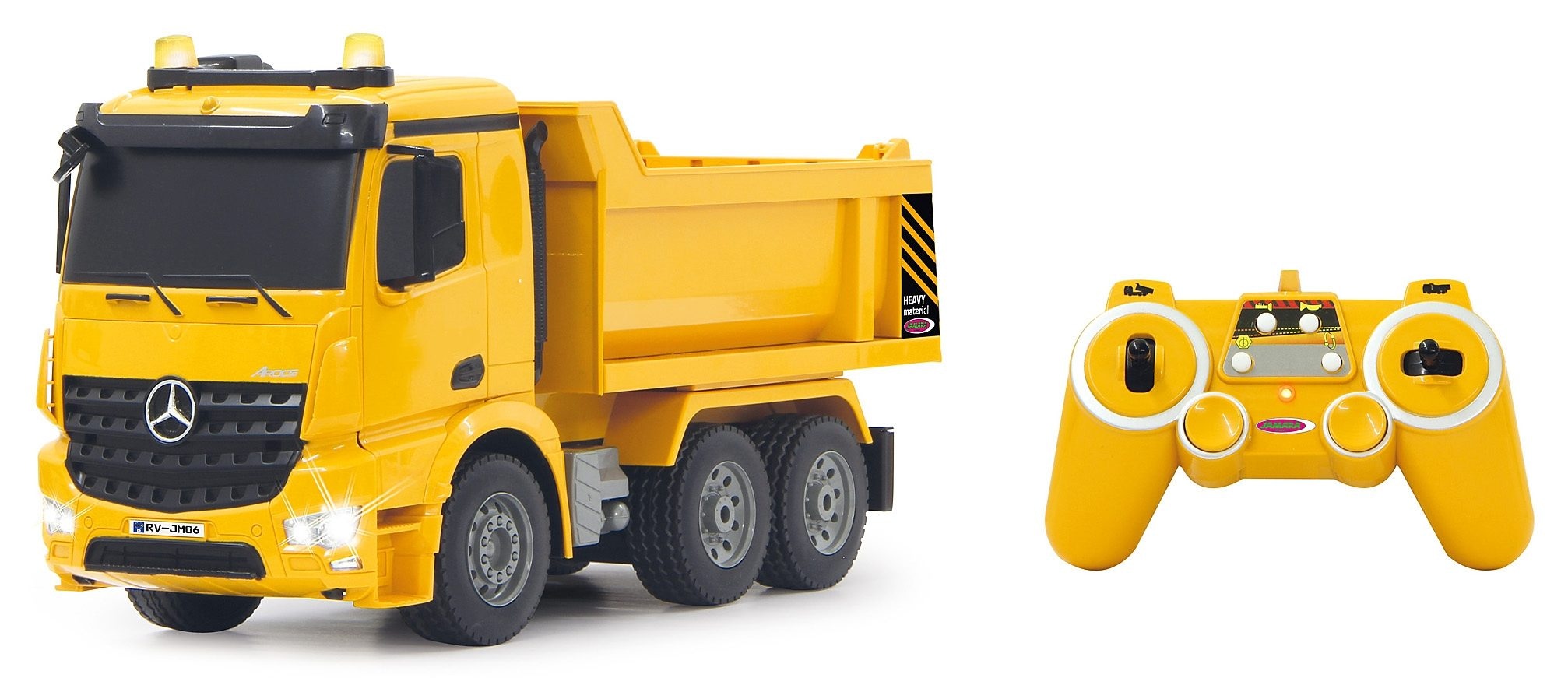 JAMARA RC Truck mit Signallichtern, Maßstab 1:20, »Muldenkipper Mercedes Arocs«. Der Held auf der eigenen Gartenbaustelle könnte dieses Modell des Mercedes Arocs sein. Mit realistischem Motorensound, Rückfahrtwarnsound und LED Signallichtern wurde das Modell dem Original detailreich nachgestellt. Zum Transport und Entladen von allen wichtigen Materialien lässt sich die Kippmulde hoch und runter fahren. Das besondere an dem Modell ist, dass der Muldenkipper selbstständig Manöver durchführen kann. Einmal die Aktion vormachen, an der Fernsteuerung speichern und schon wiederholt der Muldenkipper selbstständig die Tätigkeit. Der 4-Rad-Antrieb sorgt auch auf schwerem Terrain für einen guten Vortrieb. Erforderlich 6 Mignonbatterien. Details: Maße B/T/H: ca. 37/15/19 cm. Gewicht: ca. 1084 g. Technische Daten: Realistischer Motorsound, abschaltbar. Fahrzeit: ca. 30 min. Max. Geschwindigkeit: ca. 5-7 km/h. Hupe. Programmierbare Funktion mit Wiederholfunktion. Autoabschaltfunktion. Rückfahrwarnsound. Gelbe LED Signallichter. 4 Radantrieb. Kippmulde hoch/runter. Lieferumfang: Modell. Fernsteuerung 2,4 GHz. Anleitung. Altersempfehlung ab 6 Jahren. Warnhinweise: ACHTUNG - Benutzung unter unmittelbarer Aufsicht von Erwachsenen. ACHTUNG - Nicht für Kinder unter 36 Monaten geeignet. Erstickungsgefahr! Enthält verschluckbare Kleinteile. Über Jamara: Jamara e. K. ist ein international tätiger Großhändler für RC-Modellbau und seit über 40 Jahren ein Familienunternehmen. Vom kleinen Ladengeschäft entwickelte sich Jamara zum Global Player, der längst die Grenzen Europas überschritten hat. Ferngesteuerte Hubschrauber-, Flug-, Auto- und Schiffsmodelle sowie jegliches Zubehör wie Elektro- und Verbrennermotoren, Servos, Klebstoffe, Ladegeräte, Akkus und vieles andere mehr. Das Produktsortiment umfasst alles was groß und klein ferngesteuert Spaß macht. Heute arbeiten über hundert Mitarbeiter bei Jamara. Mit 15000 Produkten im Sortiment ist Jamara einer der größten Spielwaren- und Modellbaugroßhändler in Europa.