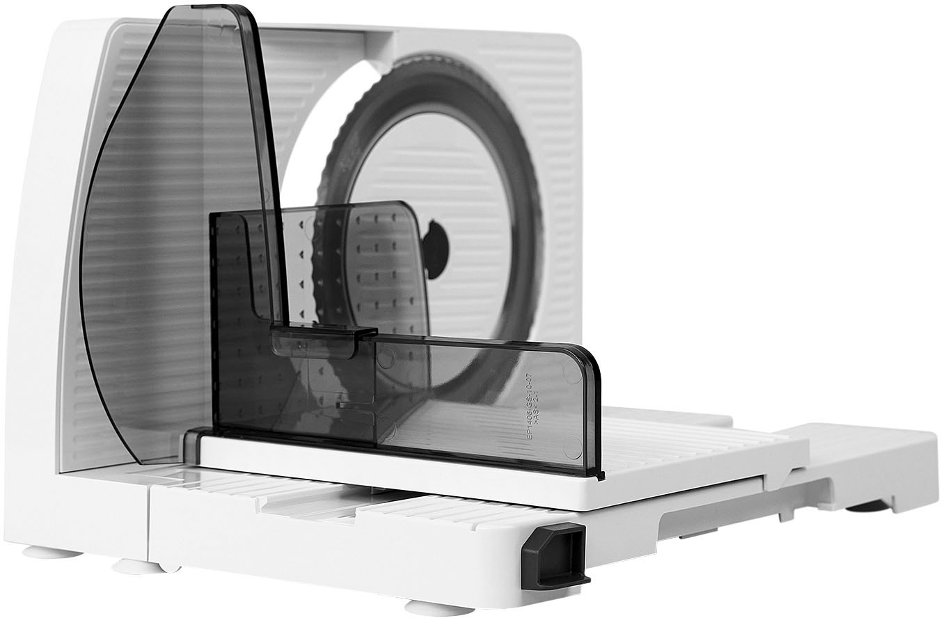 Der Restehalter schützt deine Finger und sorgt dafür, dass du zum Schneidemesser ausreichend Sicherheitsabstand einhältst. Der Schlitten ist abnehmbar, um den Allround-Schneider gründlich zu reinigen. In die Ritzen gefallene Essensreste entfernst du auf diese Art schnell und mühelos.