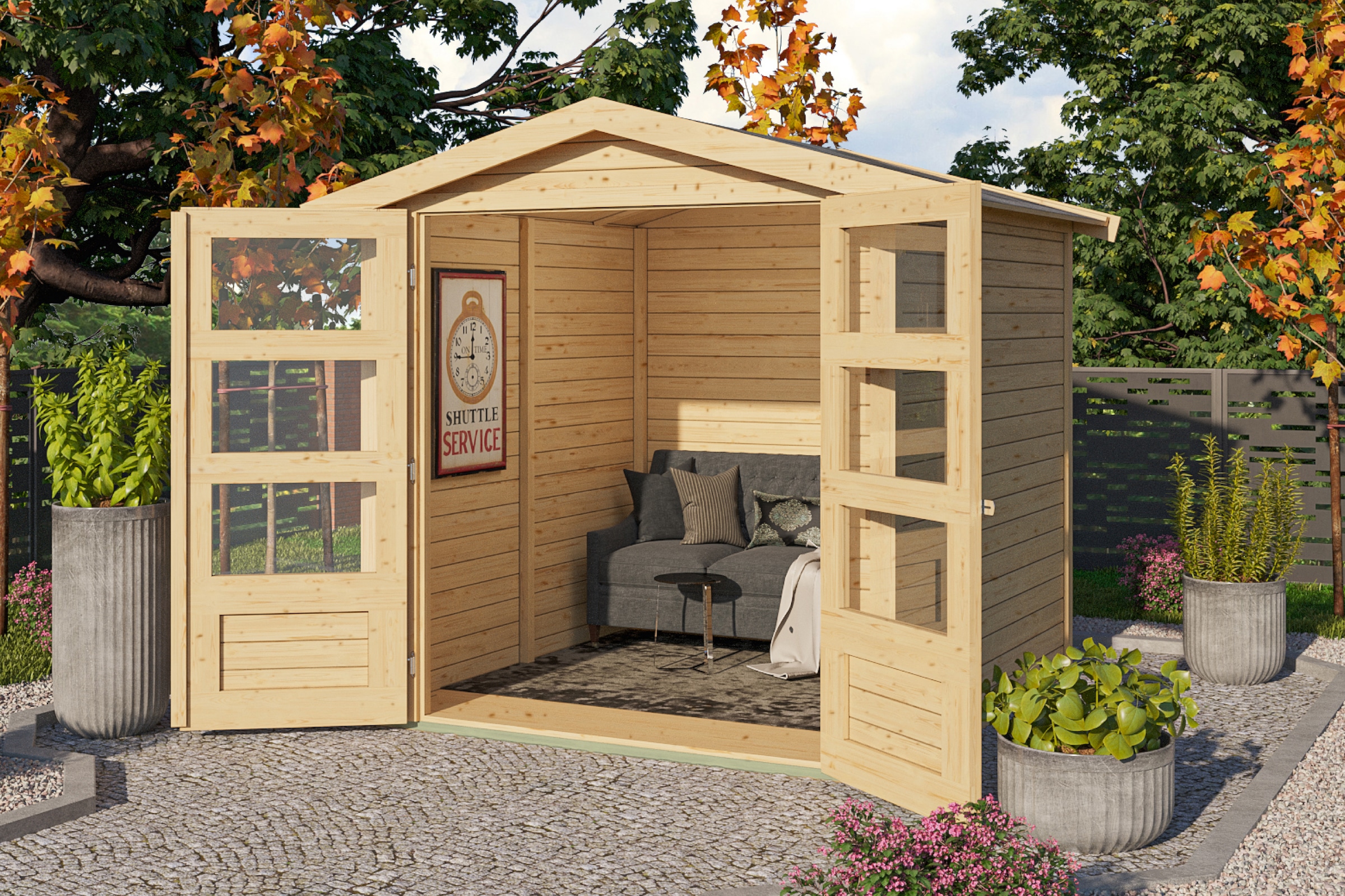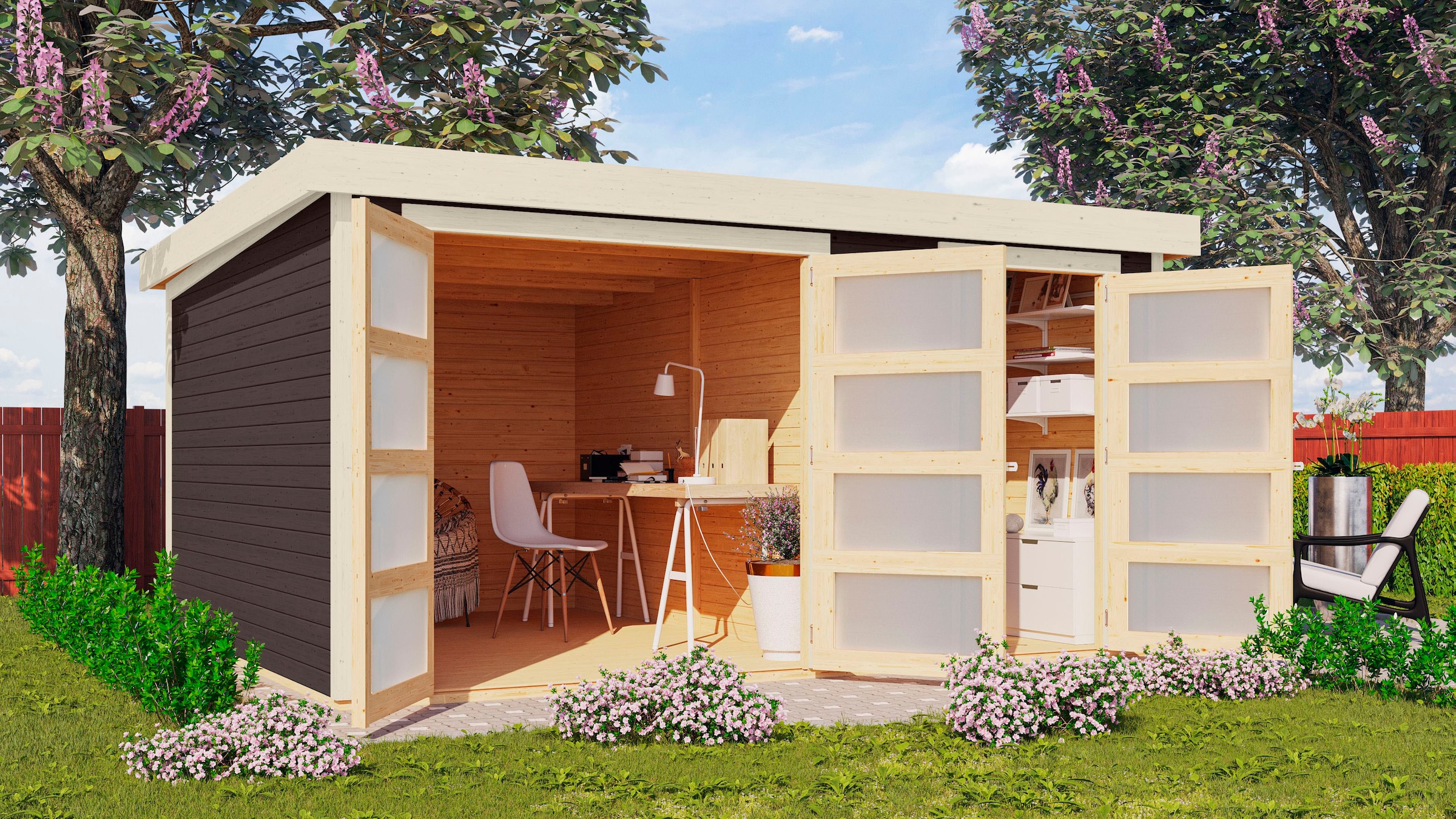 Beim Design hast du heute eine große Auswahl: Soll es ein rustikal anmutendes alpines Blockbohlenhaus sein, in dem du dich wie auf der Hochalm fühlst, oder vielleicht ein dunkelrot gestrichenes Schwedenhaus, in das auch Pippi Langstrumpf gerne einziehen würde? Zu einem sehr modern gestalteten Garten passt ein geradliniges Holzhaus mit vollverglaster Front, die sehr viel Licht hereinlässt. Hier kannst du bei kühler Witterung Sonne tanken, ohne zu frösteln.