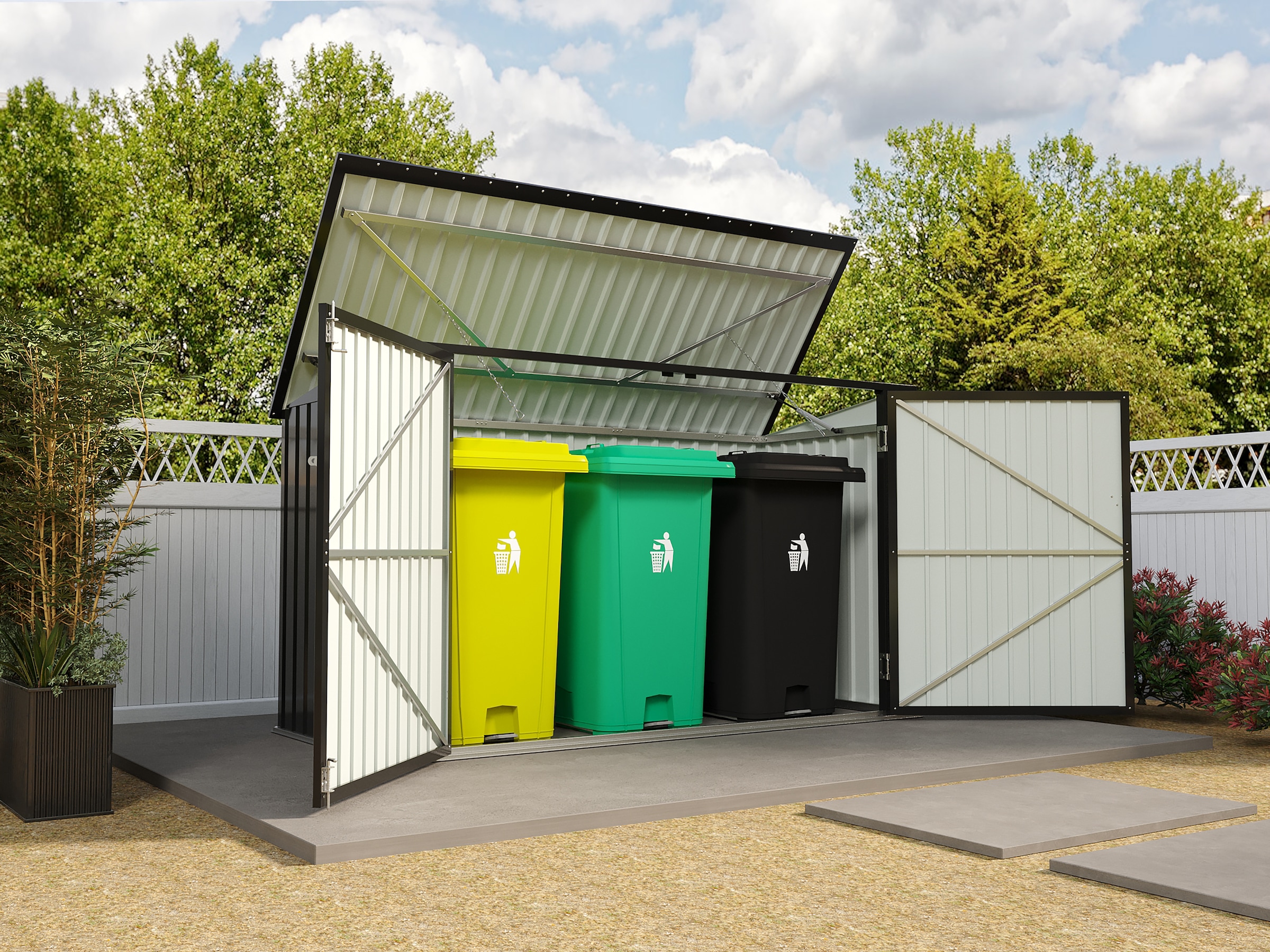 Das hängt vom gewählten Modell ab. Es gibt Modelle, die Platz für eine einzelne Tonne bieten, und andere, die genügend Raum für bis zu vier Mülltonnen haben.