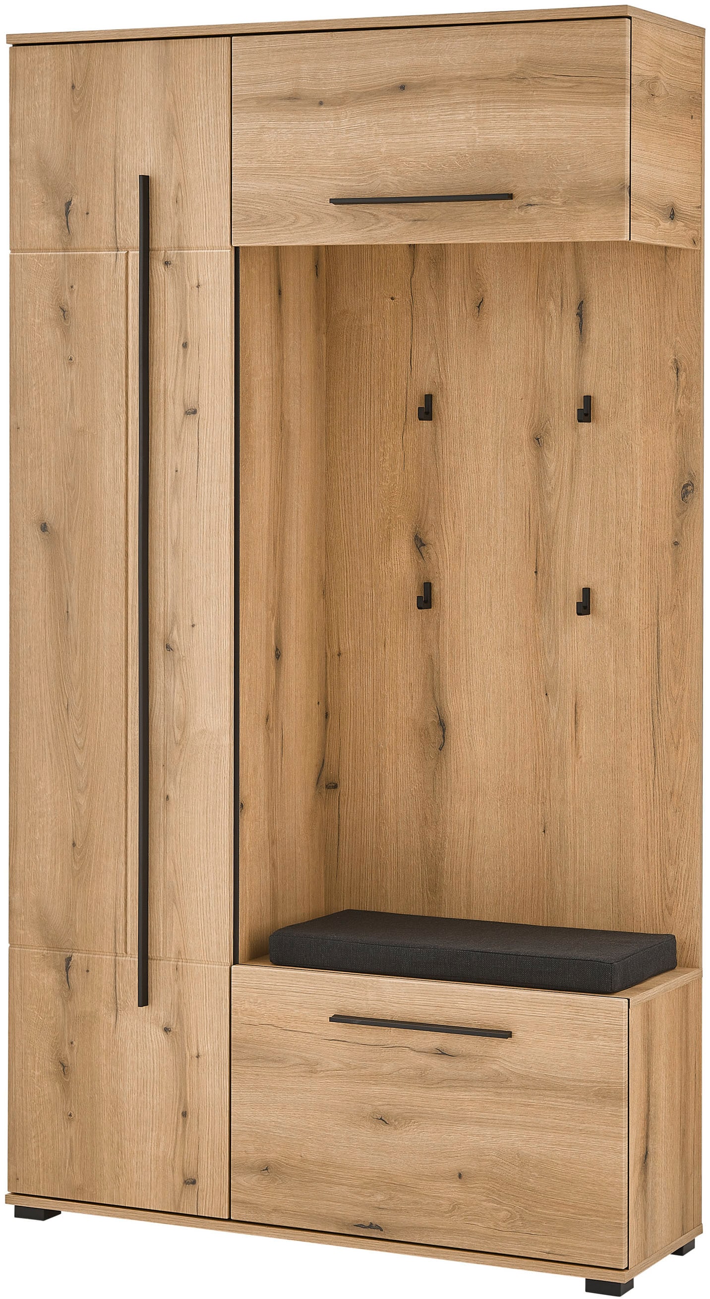 + Farben - Kompaktgarderobe »Volano in schwarz Eiche Artisan, BxHxT 114x197x40 cm« 1 Stk. tlg....HBZUrsprünglicher PreisUVP 549,00 €Rabatt- 172,01 €Aktueller Preis376,99 €