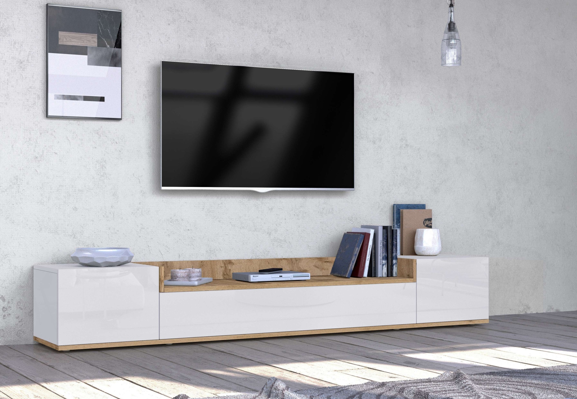 Genau wie den Fernseher kannst du auch das TV-Lowboard wahlweise aufhängen oder hinstellen. Montierst du es an die Wand, bleibt zwischen der Unterseite und dem