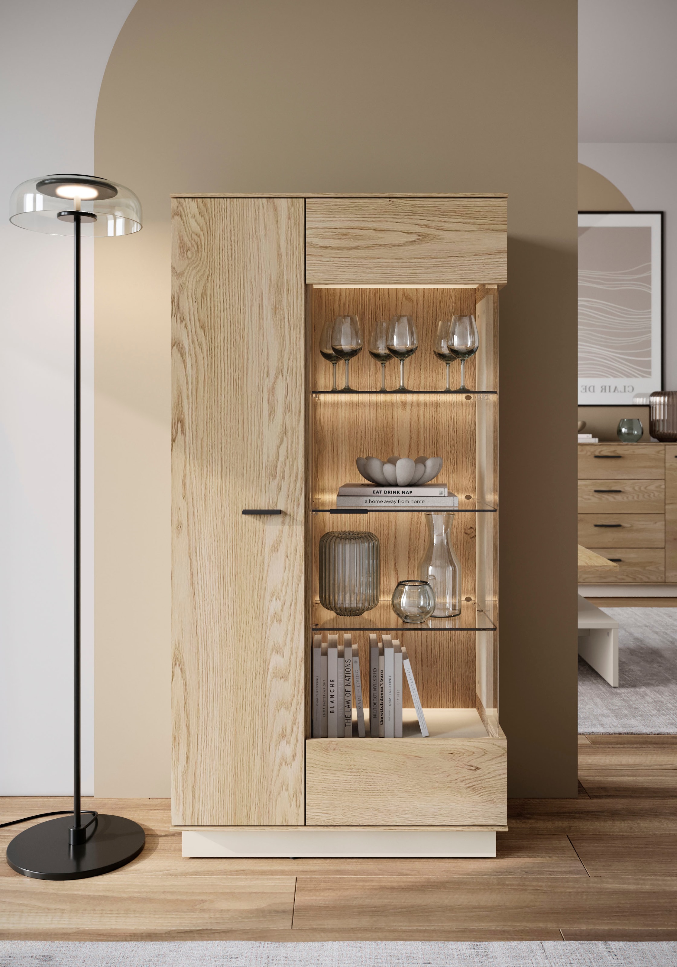 Vitrinenschränke sind Dauerbrenner der Wohnzimmer-Einrichtung, denn sie verbinden das beste beider Welten: Stauraum hinter Türen wie ein kleiner Schrank und zugleich die Präsentationsfläche eines schönen Regals.